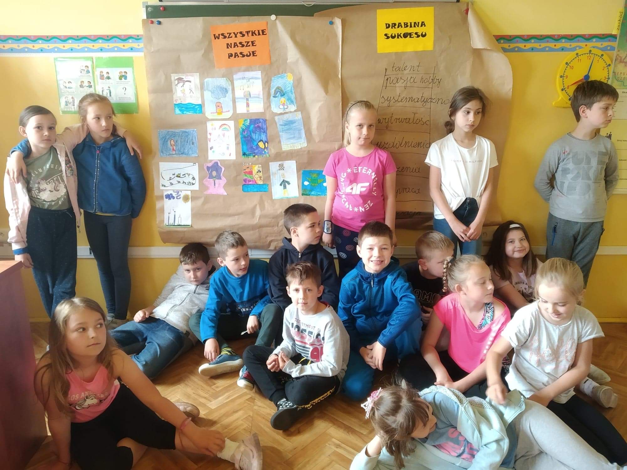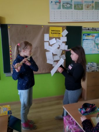 Nikomu z występujących nie można było odmówić talentu! Pokazy bardzo się podobały i zrobiły na publiczności ogromne wrażenie. Klasowe widownie zaskoczone były różnorodnością występów oraz świetnym przygotowaniem artystów. Nic więc dziwnego, że wszyscy uczestnicy pokazu nagrodzeni zostali gromkimi brawami. Bardzo się cieszymy, że mamy tak wielu zdolnych uczniów i wierzymy, że będzie ich coraz więcej. Dzisiejszy temat był również okazją do stworzenia obrazkowej galerii klasowych talentów oraz rozmowy na temat cech, które determinują osiągnięcie sukcesu w rozwijaniu swoich pasji, zainteresowań i talentów, dzięki czemu powstały drabiny sukcesu.