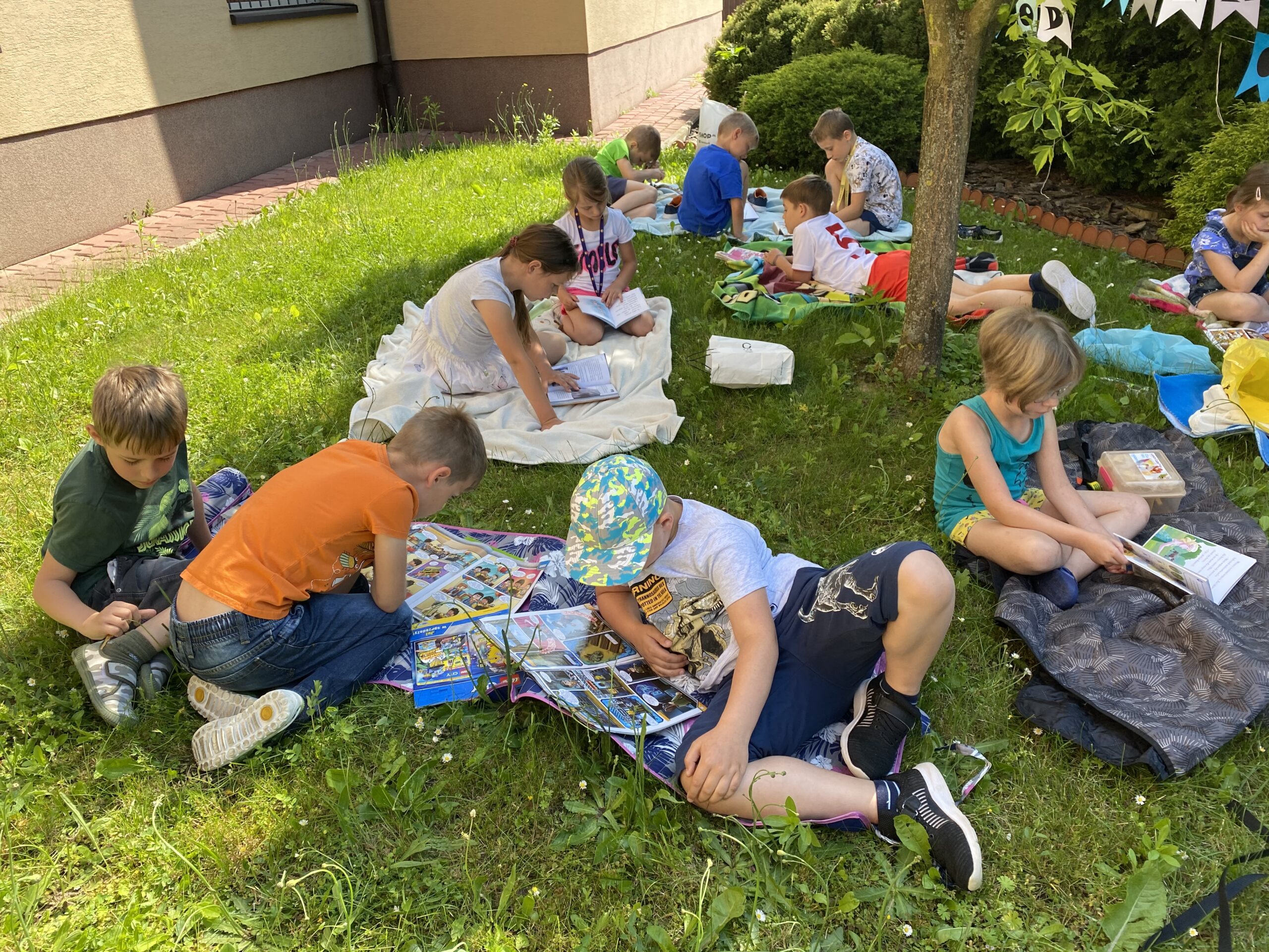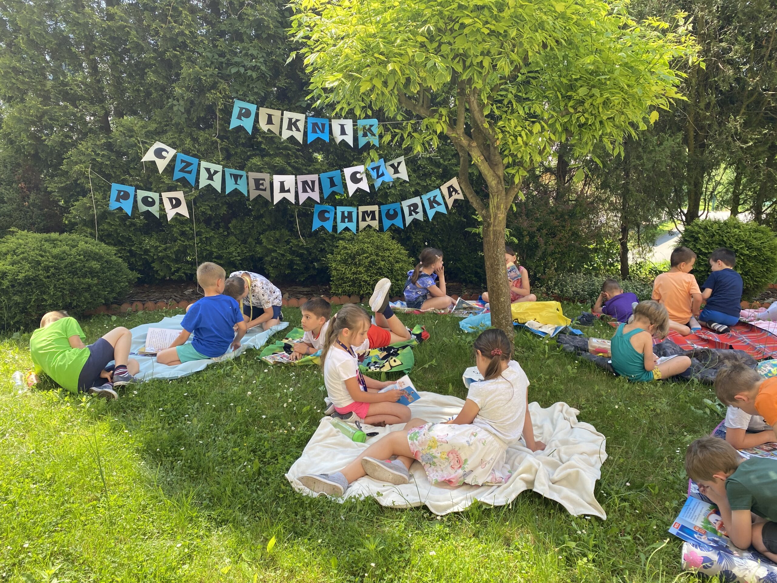 Zorganizowaliśmy lekcje pod chmurką – piknik czytelniczy pod chmurką. W słoneczny dzień wzięliśmy koce, książki oraz sprzęt sportowy i w otoczeniu zieleni, z naszymi ulubionymi książkami, rozpoczęliśmy naszą wyjątkową lekcję. Dzięki tropom przypomnieliśmy sobie dlaczego warto czytać. Zajęcia zakończyliśmy zabawami ruchowymi na szkolnym placu zabaw.