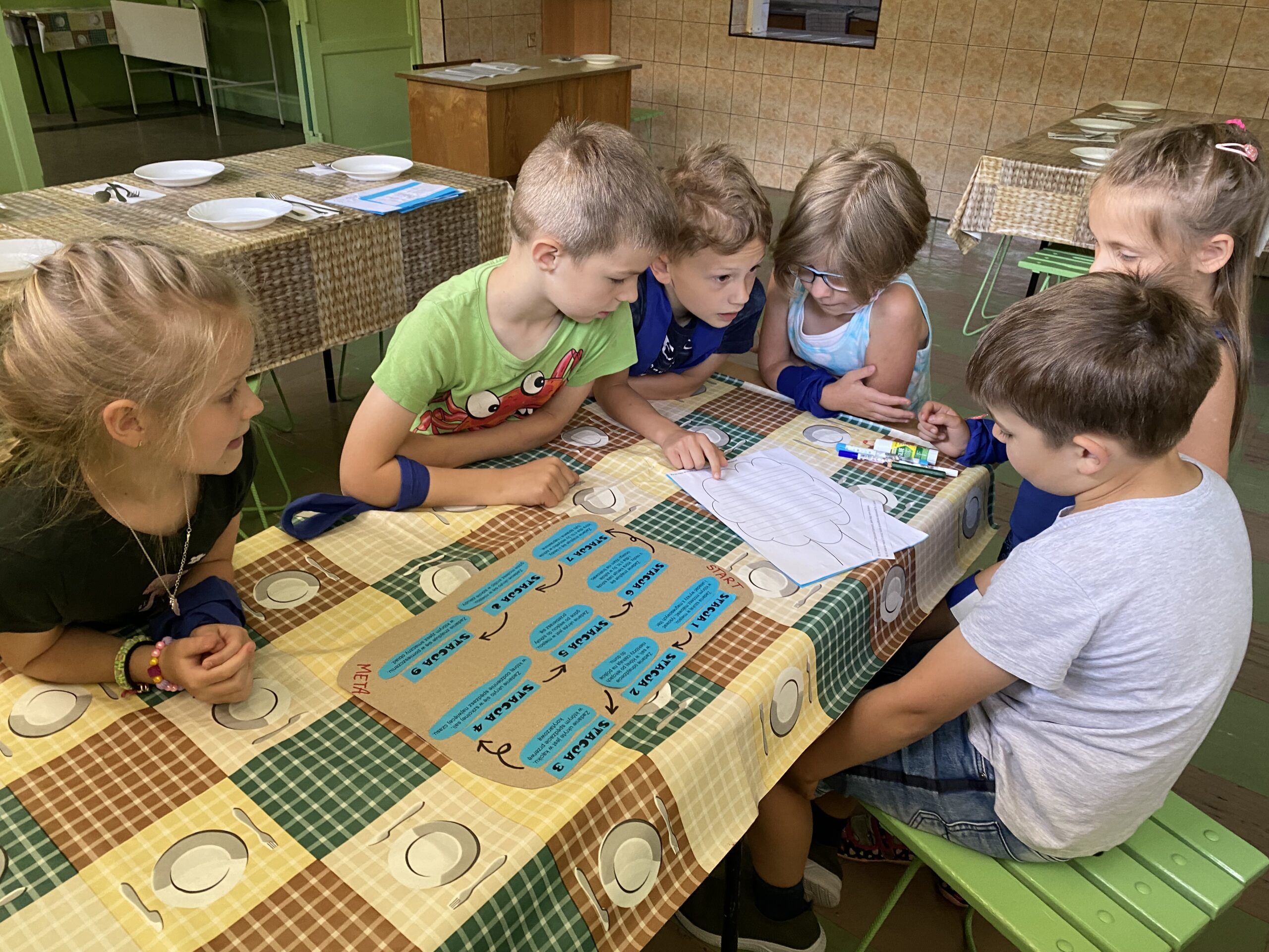 Świetną zabawą była również gra terenowa o charakterze czytelniczo – ekologicznym na terenie szkoły. Odbyła się z okazji Dnia Ochrony Środowiska. Podzieleni na trzy losowo wybrane zespoły, z pomocą Pani Bibliotekarki i Pani Pedagog ruszyliśmy z mapami w poszukiwaniu zadań. Uczniowie mieli dotrzeć w jak najszybszym czasie do zaznaczonych na planie punktów i wykonać poszczególne zadania. Punkty zadaniowe były usytuowane w każdym zakamarku szkoły (m.in. w Sekretariacie, Bibliotece, w jadalni, u Pani Pedagog, w kącikach czytelniczym, w salach lekcyjnych, na hali, w szatni itp.). W punktach zadaniowych wyznaczone osoby przekazywały zespołom kartę zadań, oceniały prawidłowość wykonania zadania i przyznawały punkty. I tak, wśród zadań pojawiło się: rozpoznawanie tytułów lektur, nazwiska autora, głównych wydarzeń, krzyżówka ekologiczna, segregowanie odpadów, wypisywanie korzyści z drzew, przyznawanie mandatów za nieekologiczne zachowania mieszkańców, ocena postępowania osób oraz inne równie ekscytujące wyzwania. Zabawa była doskonała, a rywalizacja zacięta.