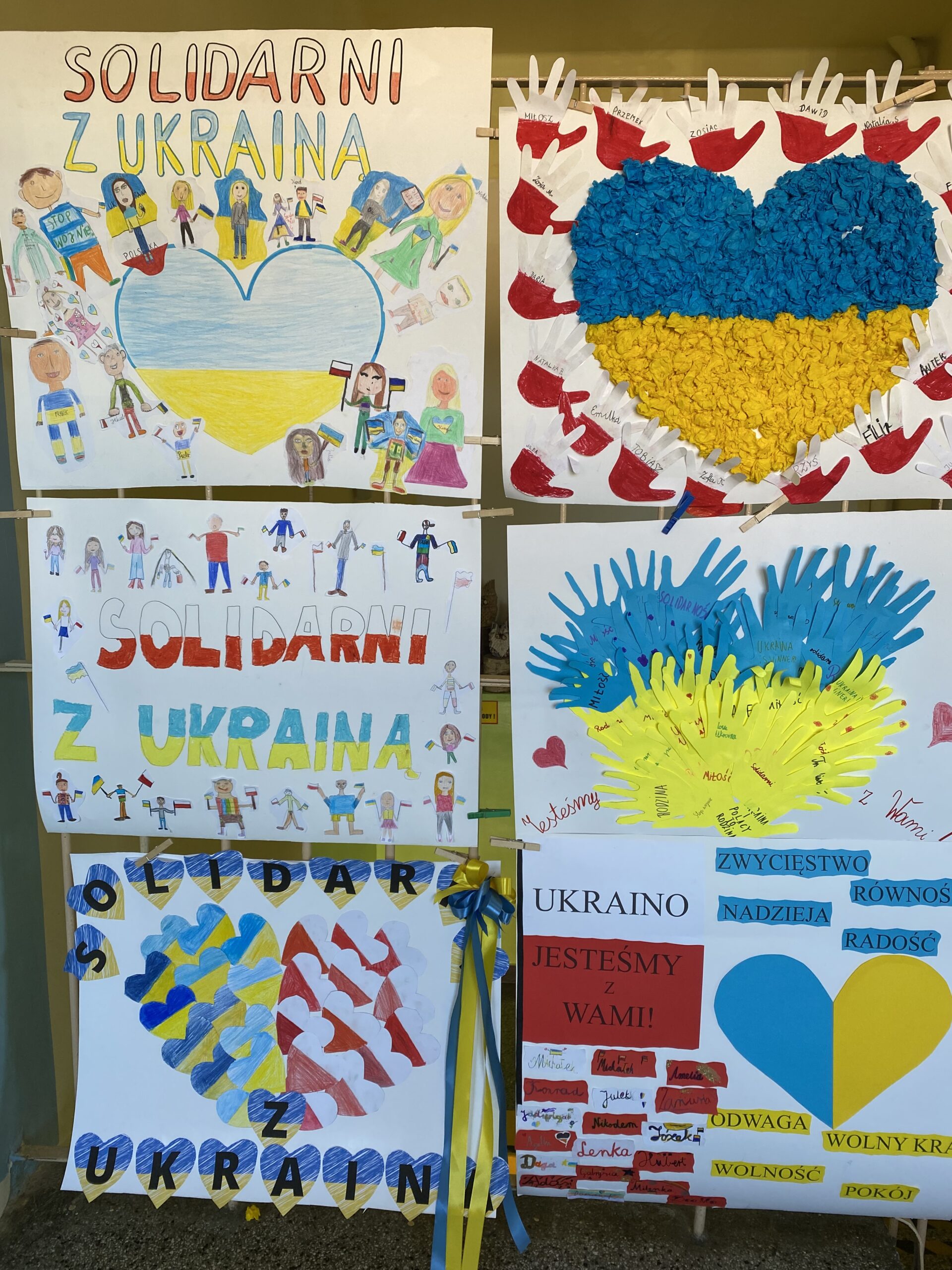 - Uczniowie najmłodszych klas pod okiem pań wychowawczyń przygotowali plakaty. Korytarze szkolne zajaśniały niebiesko – żółtymi barwami. We wszystkich klasach odbyły się lekcje tematycznie powiązane z Ukrainą. Omawiano jej historię, poznawano zwyczaje i dyskutowano na tematy związane z wolnością, ojczyzną i poczuciem tożsamości narodowej.