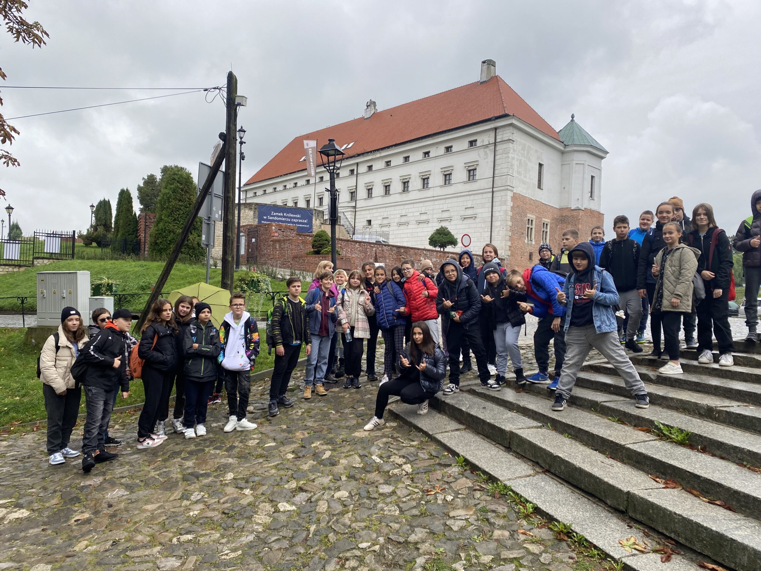 29 września uczniowie klas szóstych udali się na wycieczkę do Sandomierza. Jej celem było odkrywanie piękna ojczystego kraju poprzez poznawanie jednego z najstarszych i najpiękniejszych miast położonego nad Wisłą na siedmiu wzgórzach. Razem z przewodnikiem wędrowaliśmy pięknymi uliczkami, podziwiając Dom Długosza, Collegium Gostomianum, Rynek, Stare Miasto, zamek z zewnątrz, ratusz, zabytkowe kamienice, dawną synagogę, kościół świętego Ducha, kościół świętego Michała, Ucho Igielne. Przewodnik pokazał nam również miejsca, w których kręcone są kolejne sceny serialu ,,Ojciec Mateusz”. Wielką atrakcją okazały się warsztaty zielarskie. Rozpoczęliśmy od przejścia przez symboliczne drzwi i wkroczyliśmy do świata Marcina z Urzędowa – osoby, która mieszkała w Sandomierzu. W 1553 roku ukończył on dzieło „Herbarz Polski to jest o przyrodzeniu ziół i drzew rozmaitych i inszych rzeczy do lekarstw należących księgi dwoje”. Oryginalny egzemplarz herbarza znajduje się na ekspozycji. Na parterze zwiedziliśmy dwie sale. W pierwszej szukaliśmy informacji o roślinach ziołowych i różnych terapiach stosowanych na przestrzeni wieków, w kolejnej była ekspozycja dotycząca trujących roślin i grzybów. Naszym zadaniem było znaleźć odpowiedzi na pytania przygotowane na karcie warsztatów. Nagrodą za poprawne odpowiedzi była sandomierska krówka. Na piętrze czekała na nas inna tematyka. Stworzone tam zostały kuchnia, pokój i łazienka, a na półkach i w wielu innych miejscach były produkty wytworzone z roślin. Tuż przy schodach ustawiono krowę, która jest pusta w środku. Legenda mówi, że kiedyś, aby usunąć skutki trucizny, należało zabić krowę, wyjąć wnętrzności i wejść do środka, a toksyna zostawała wchłonięta. Oprócz pomieszczeń domowych i krowy na piętrze był niewielki labirynt z pieczątkami grzybów trujących i jadalnych.