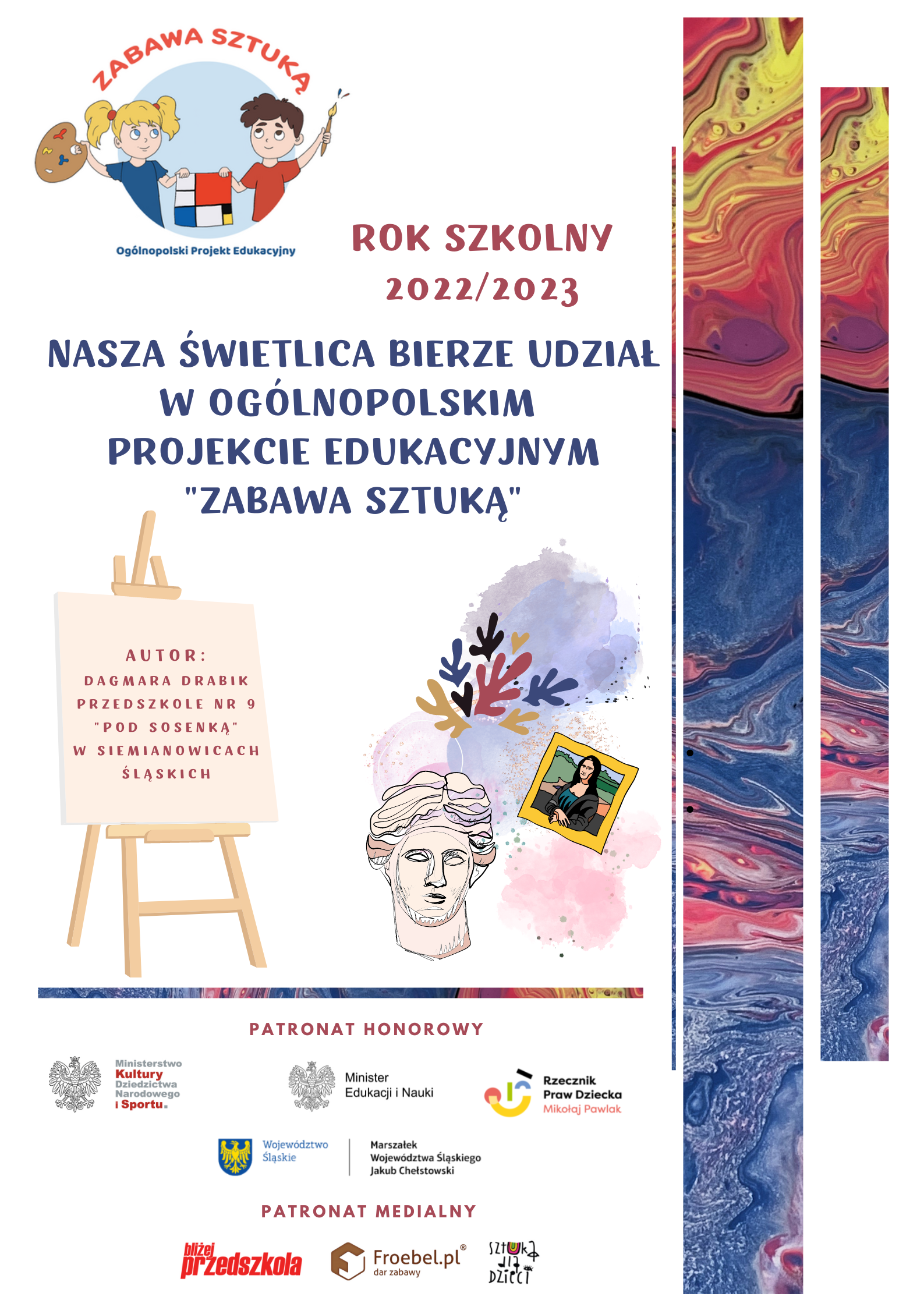 W roku szkolnym 2022/2023 uczniowie uczęszczający na zajęcia świetlicowe biorą udział w Ogólnopolskim Projekcie Edukacyjnym „Zabawa sztuką”. Projekt bazuje na założeniach Friedricha Froebla. Jednym z podstawowych założeń pedagogiki freblowskiej jest zabawa, a jak dodamy do tego sztukę, to powstanie nam wyjątkowa “Zabawa sztuką”. Głównym celem projektu jest propagowanie sztuki w korelacji z kompetencjami kluczowymi. Projekt jest zgodny z podstawą programową kształcenia ogólnego dla szkoły podstawowej oraz podstawowymi kierunkami realizacji polityki oświatowej w roku szkolnym 2022/2023.