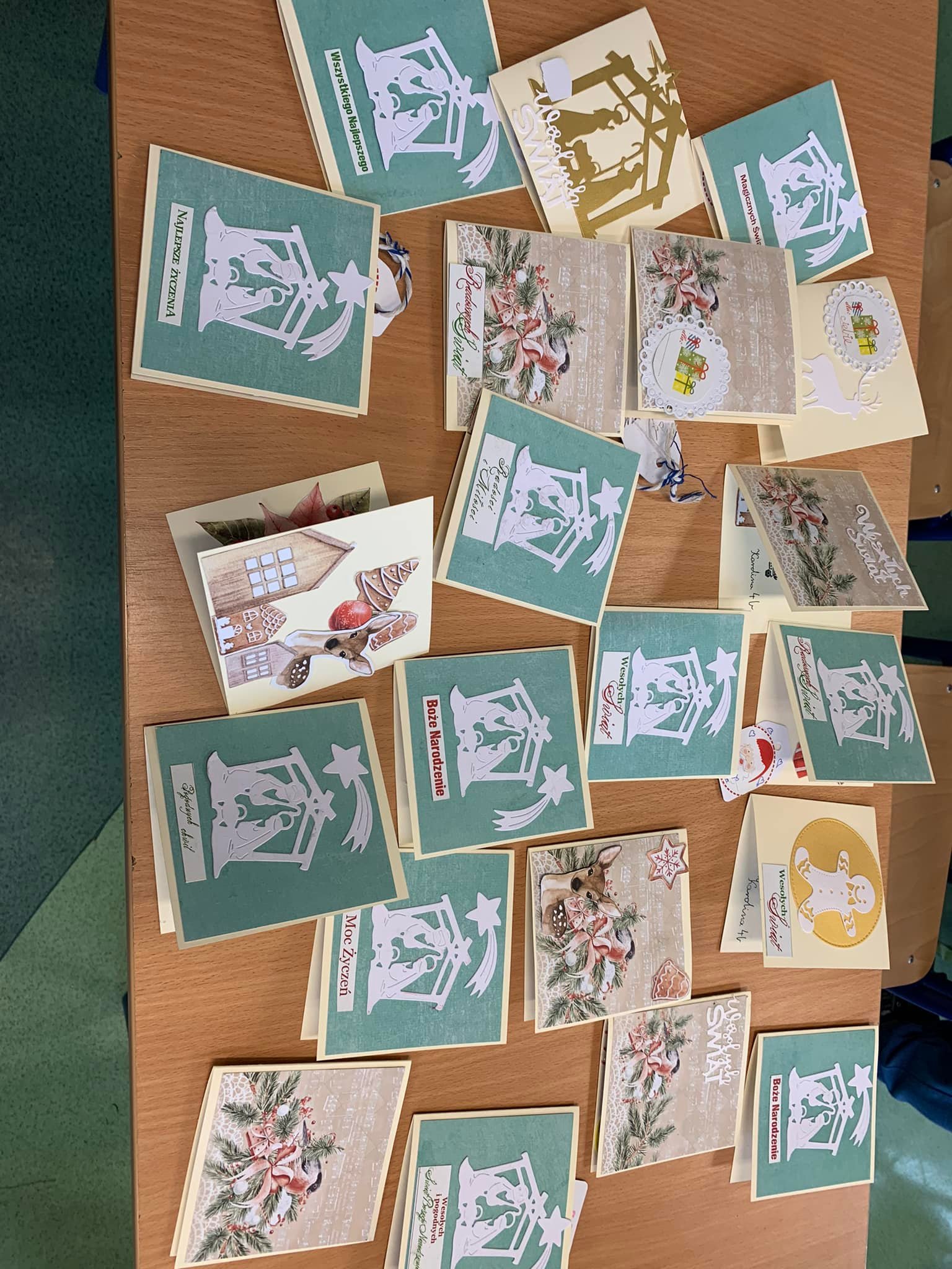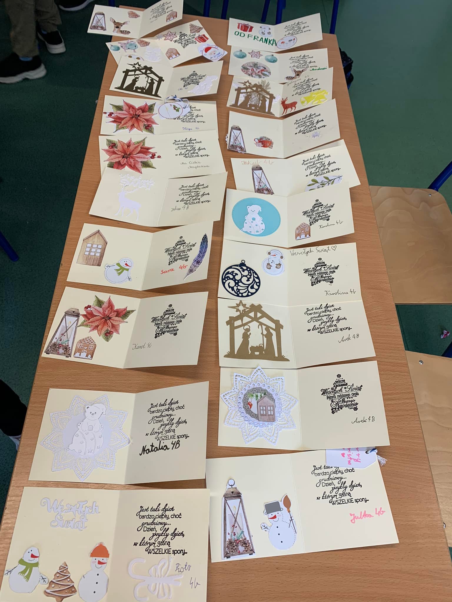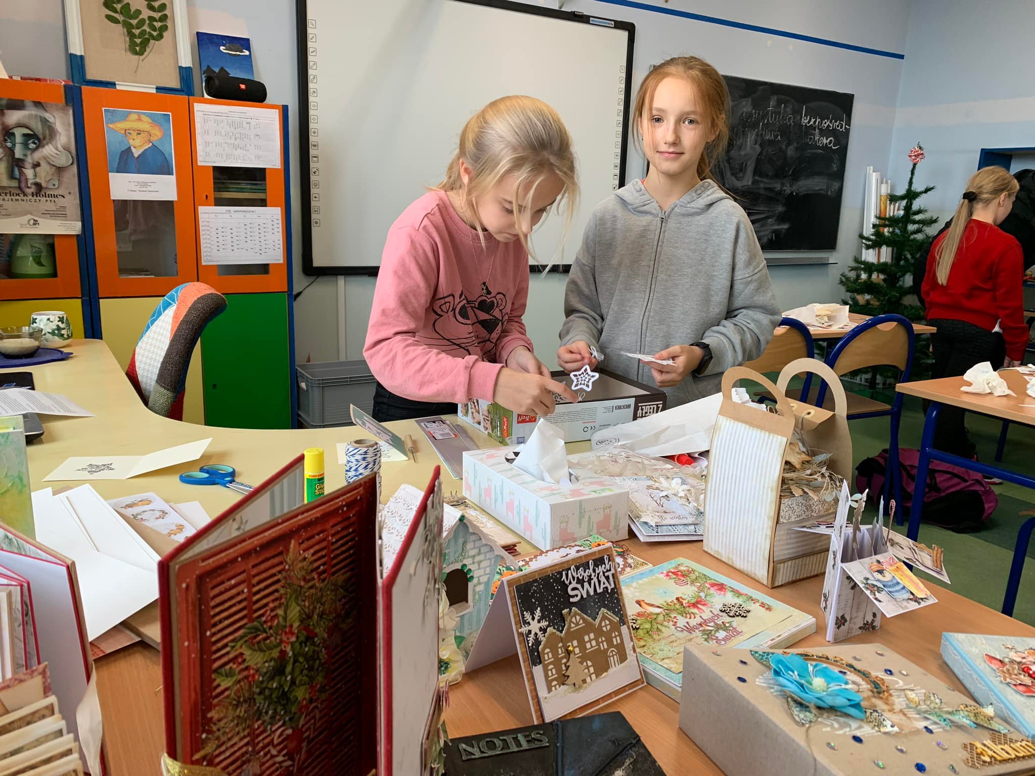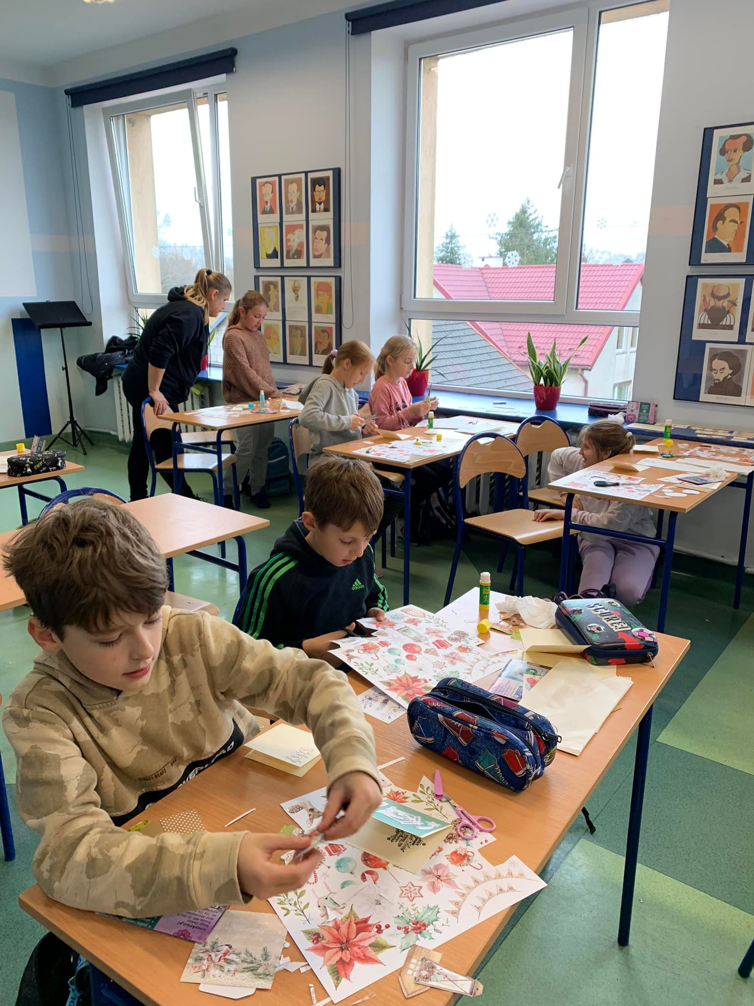 Klasa 4b wzięła udział w mini warsztatach scrapbookingowych, na których uczniowie mogli poznać przeróżne możliwości wykorzystania kartki papieru i jej ozdabiania. Z przygotowanych elementów każdy uczestnik zajęć wykonał dwie kartki świąteczne wg własnego pomysłu. Kartki z życzeniami świątecznymi podarujemy małym pacjentom oddziału onkologii i hepatologii Dziecięcego Szpitala w ramach akcji „Uśmiech na gwiazdkę w Prokocimiu”.