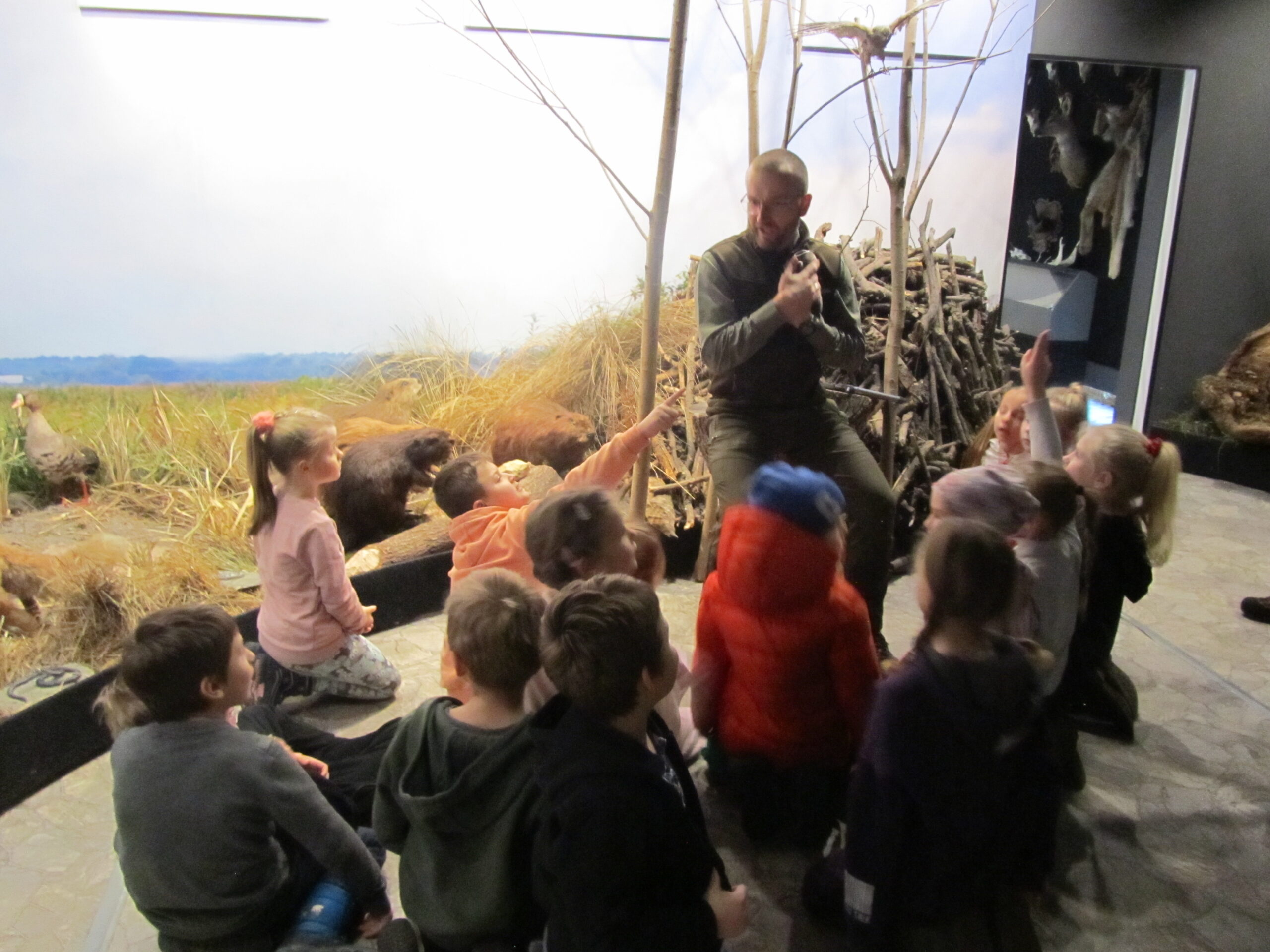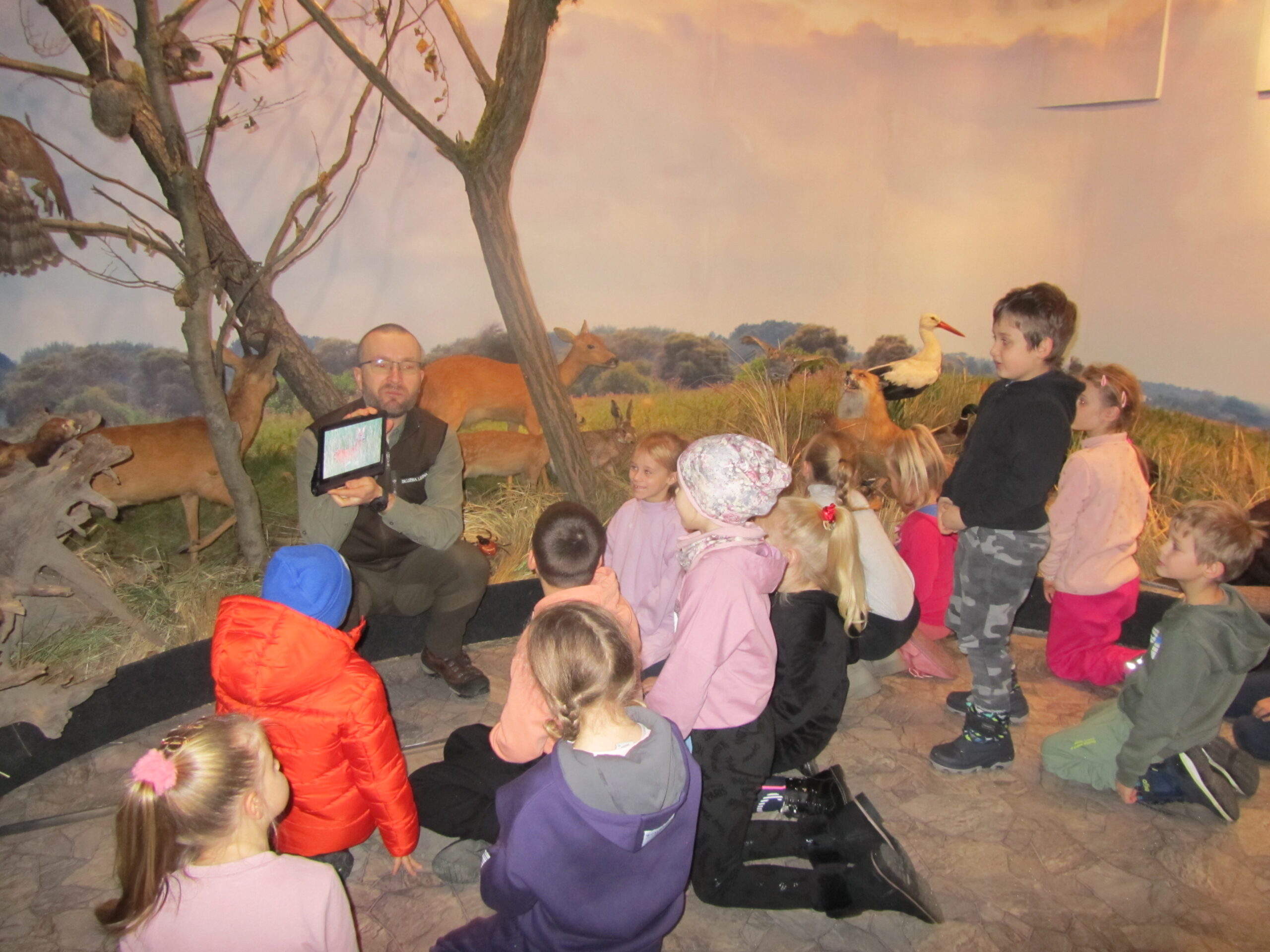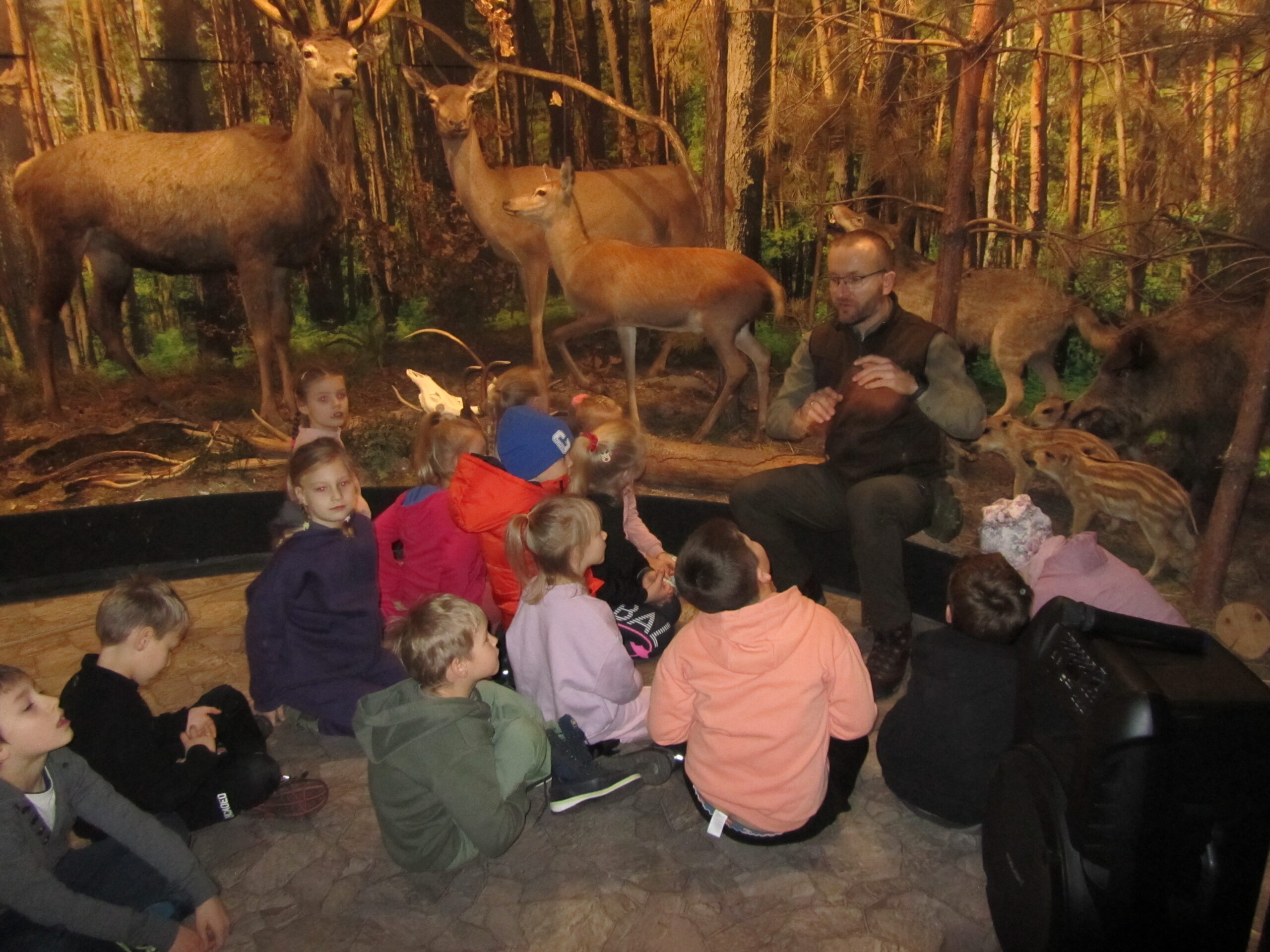 W piątek, 9 grudnia uczniowie z klasy 1b wybrali się na wycieczkę edukacyjną do Nadleśnictwa w Niepołomicach. Pierwszaki wzięły udział w prowadzonych przez leśnika zajęciach przyrodniczo-leśnych w Izbie Leśnej. Podczas spotkania pracownik nadleśnictwa bardzo ciekawie opowiadał o życiu zwierząt z Puszczy Niepołomickiej. Dzieci dowiedziały się też czym zajmuje się leśniczy i na czym polega jego praca. Leśnym opowieściom nie było końca. Uczniowie mogli także obejrzeć zgromadzone w Izbie Leśnej ekspozycje spreparowanych zwierząt w ich naturalnym środowisku. Spotkanie to dostarczyło uczniom wiele wiedzy na temat życia w otaczającej nas przyrodzie i jej poszanowania.