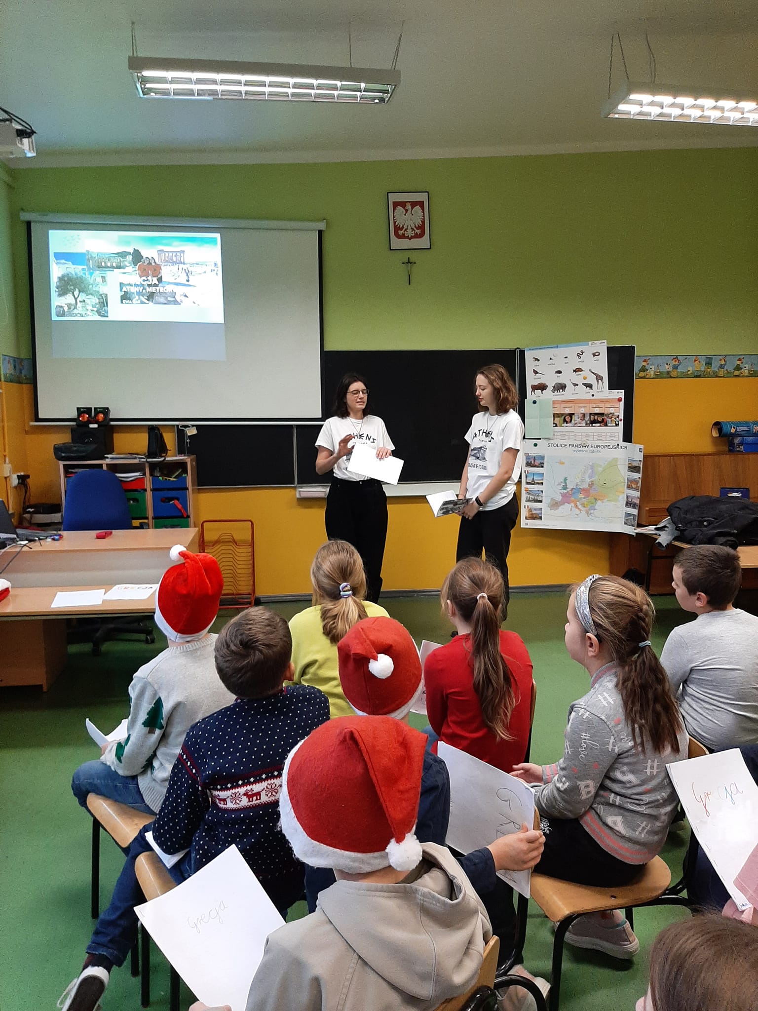 Klasę IIIa odwiedziły dziś… podróżniczki – Ewa i Karolina. Dziewczyny po podróży do Grecji podzieliły się z trzecioklasistami swoimi wrażeniami. Dowiedzieliśmy się, co warto w Grecji zwiedzić, co zjeść /smakowaliśmy greckich cukierków/. Poznaliśmy kilka mitów greckich, nauczyliśmy się prostych słówek. Wspólnie śpiewaliśmy piosenkę po grecku i liczyliśmy do 10. Opowieści naszych podróżniczek udokumentowane zdjęciami były tak fascynujące, że już dziś każdy z nas planuje podróż do Grecji.