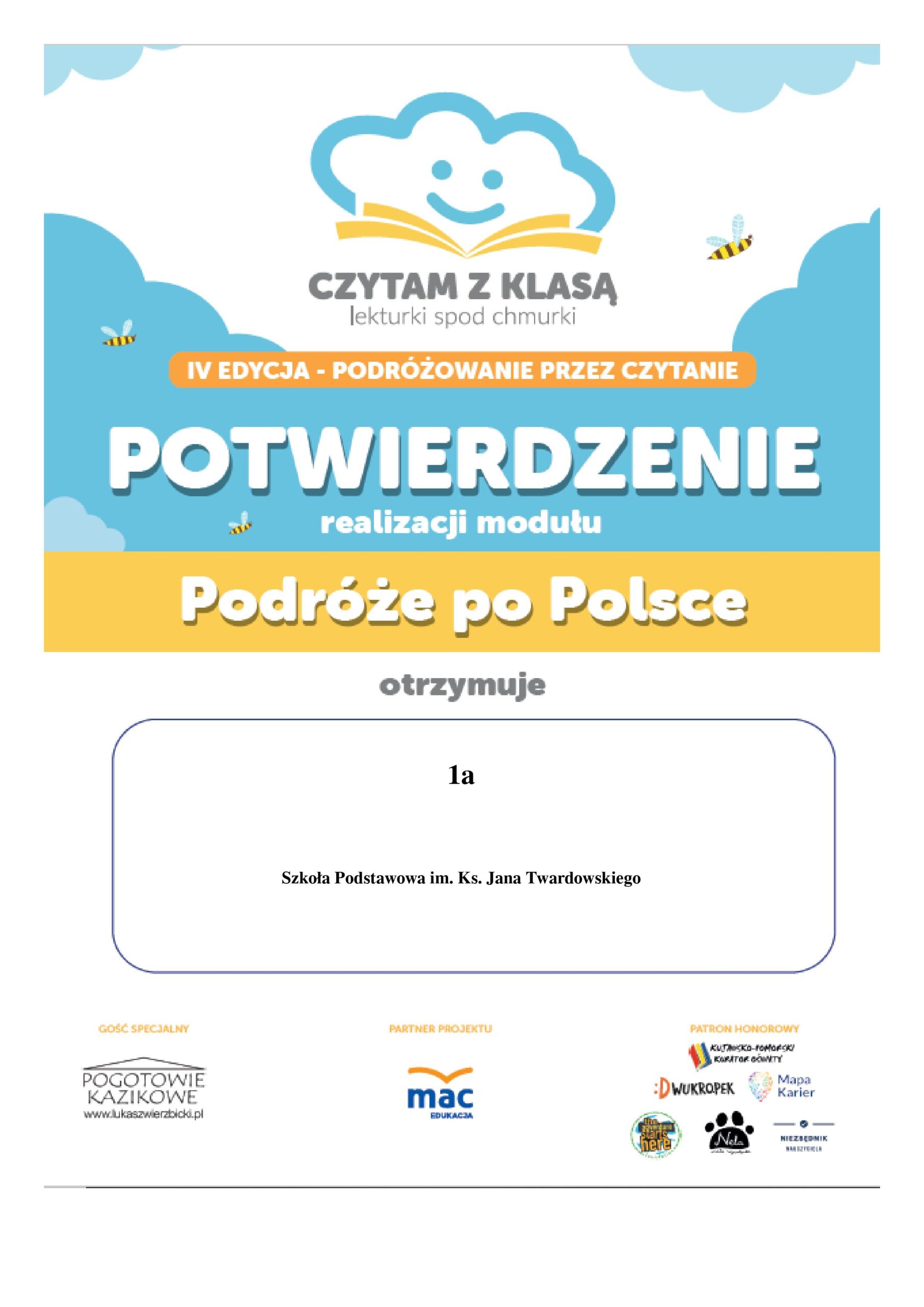 Klasa 1a wykonała zadania przypadające na I moduł projektu „Czytam z klasą – Lekturki spod chmurki”. W I module poprzez czytanie podróżowaliśmy po Polsce. Naszą podróż rozpoczęliśmy z bohaterami lektury Agnieszki Frączek „Rany Julek ! O tym jak Julian Tuwim został poetą”.