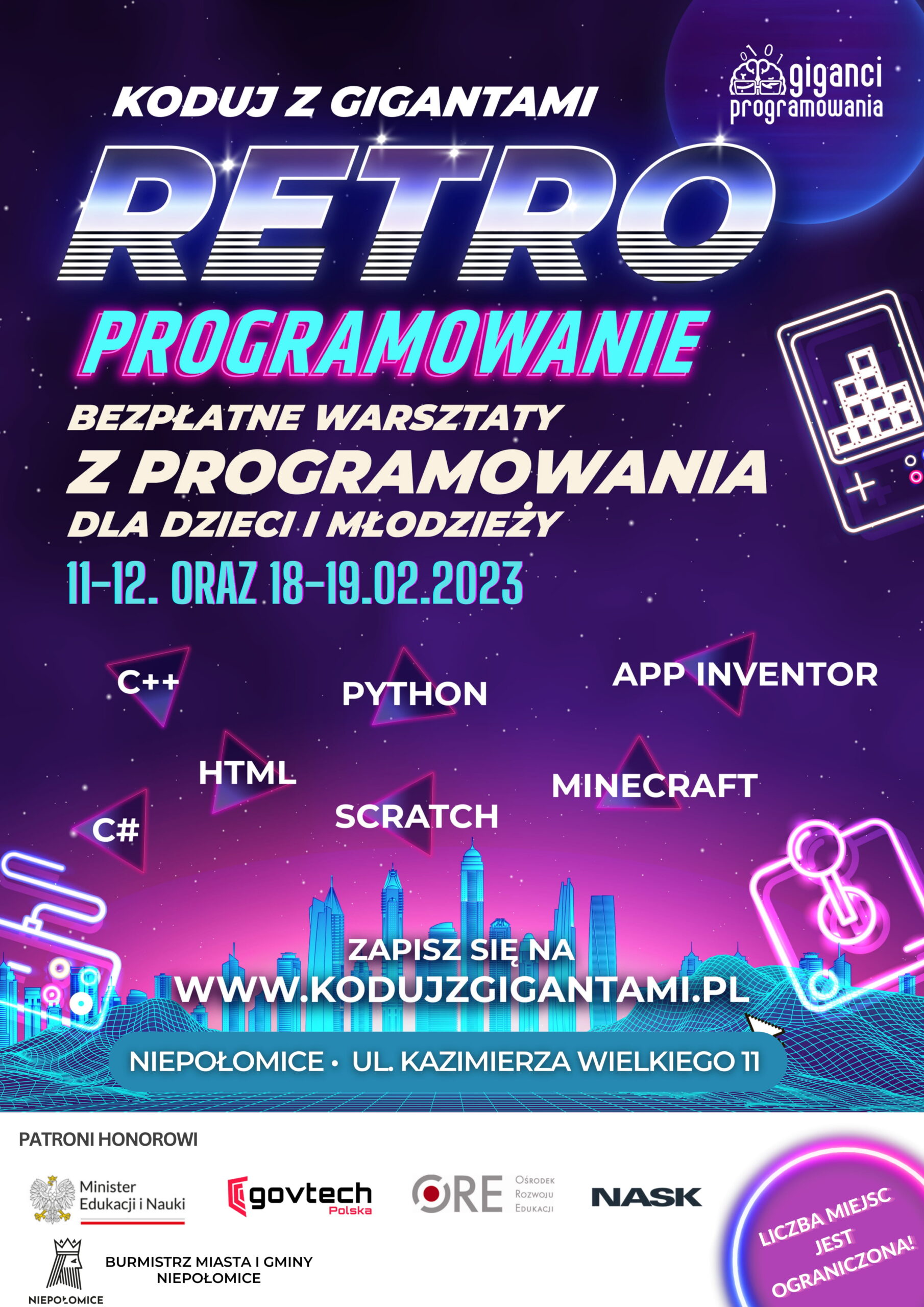 Zajęcia odbędą się w Niepołomicach przy ul. Kazimierza Wielkiego 11 oraz online. Zapisy na: https://www.kodujzgigantami.pl/