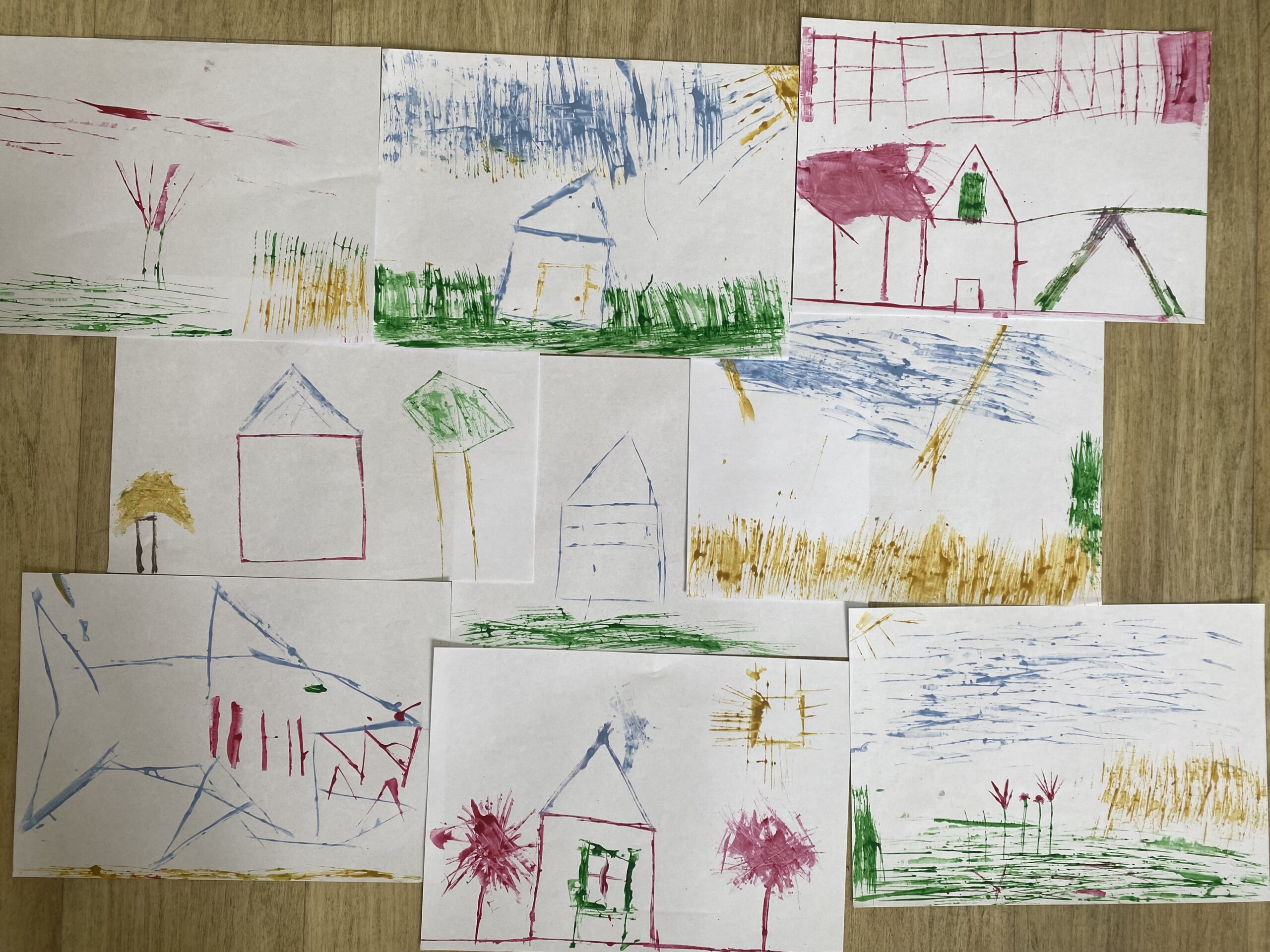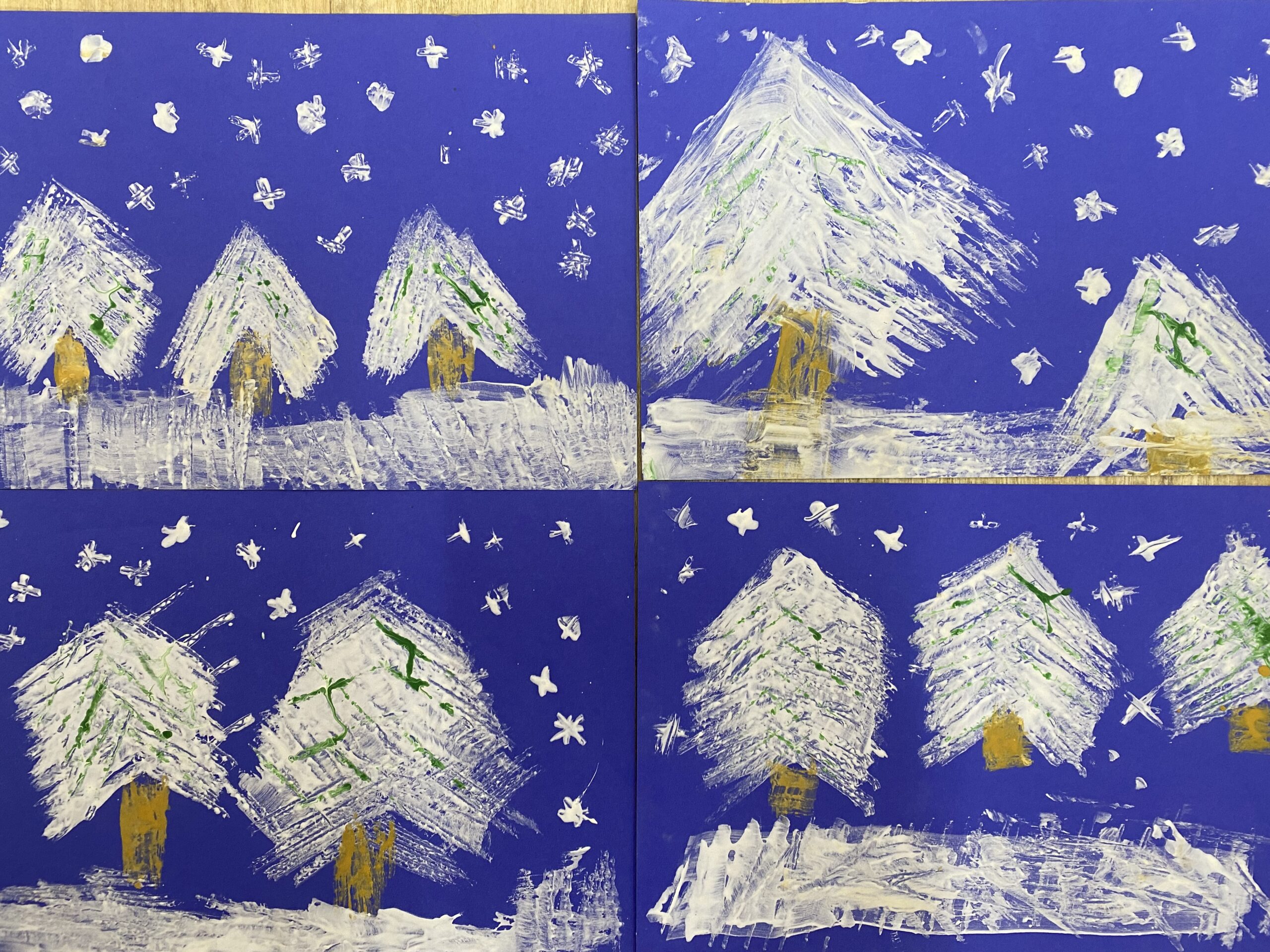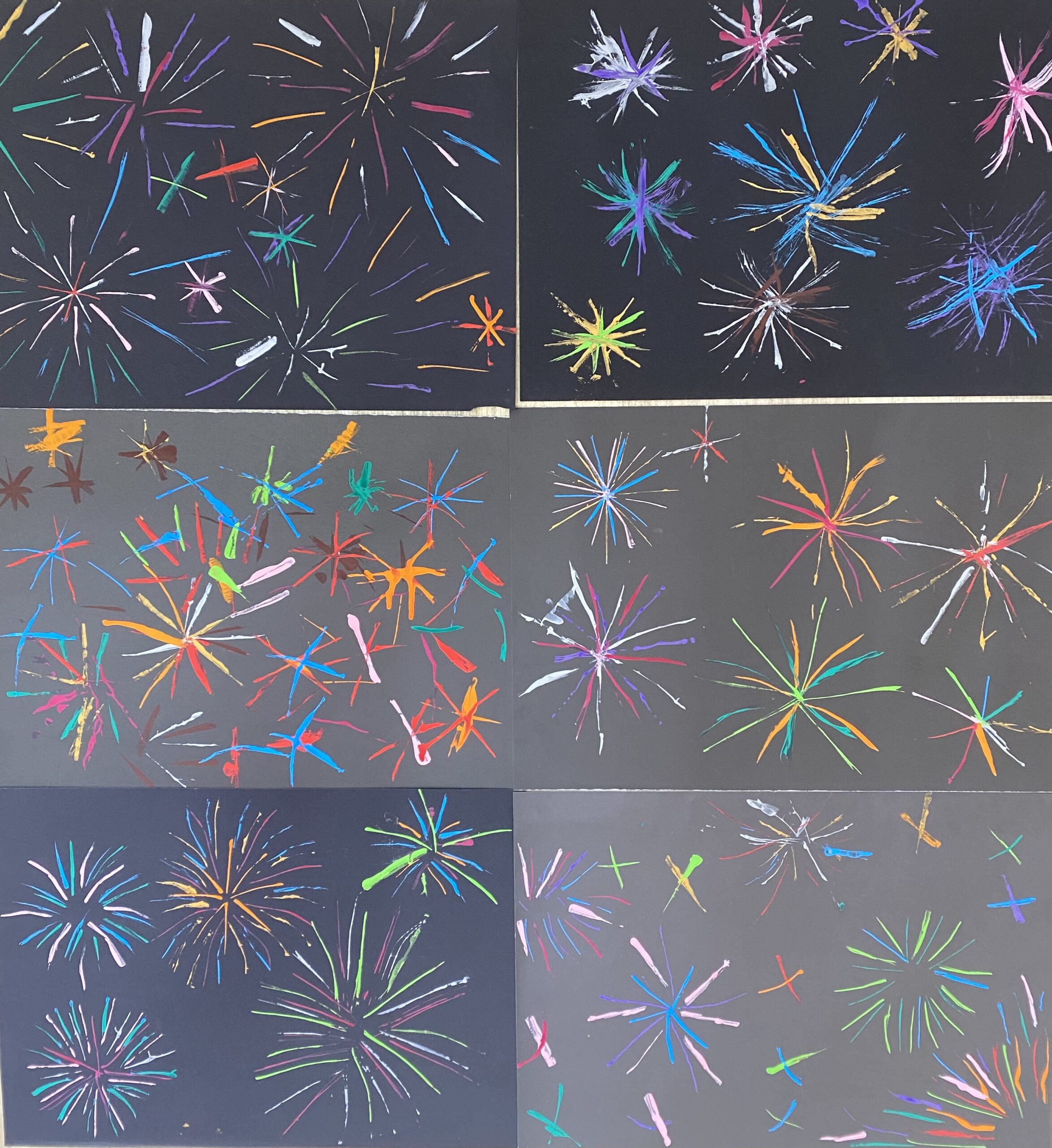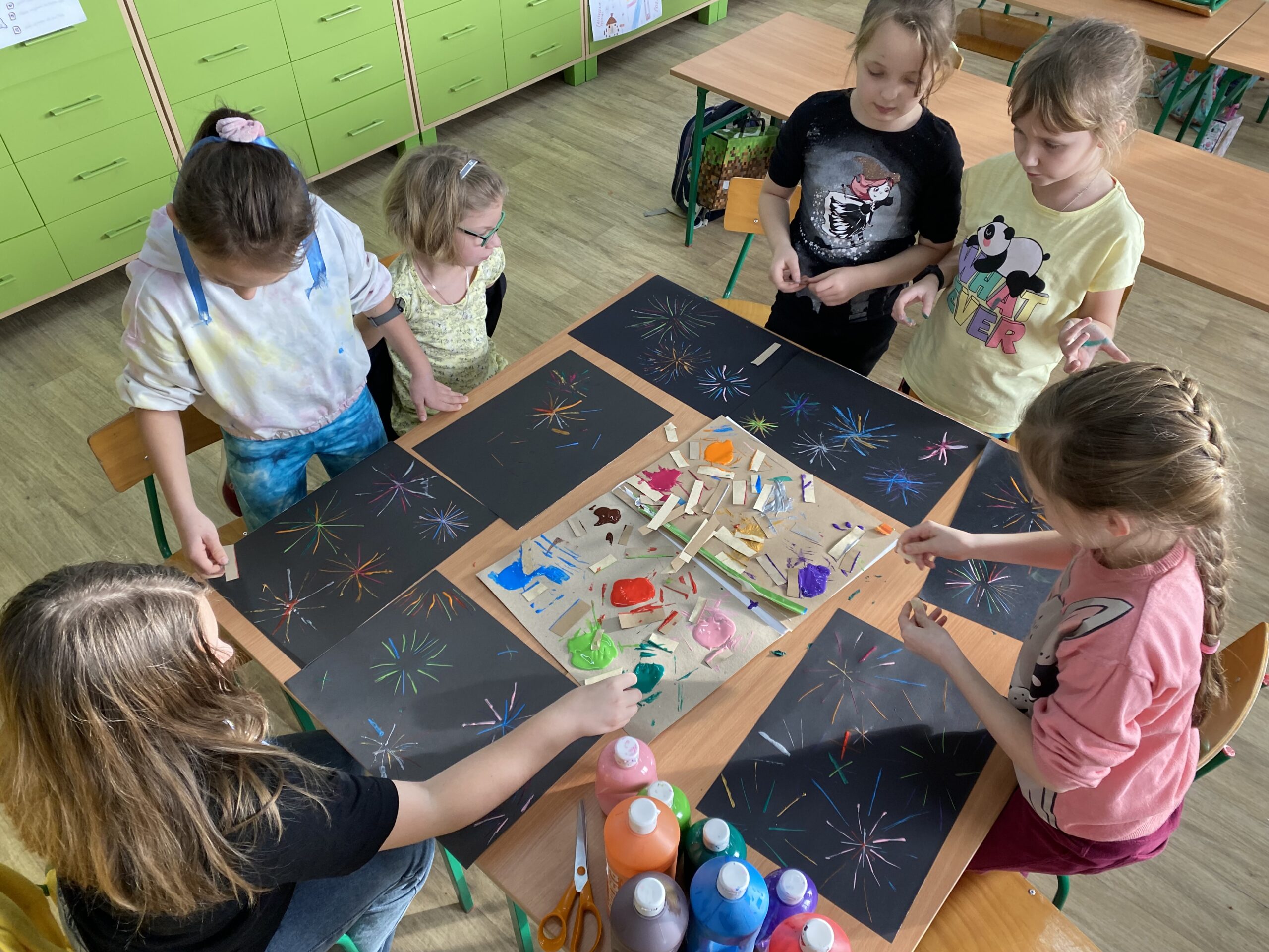 Uczniowie przy pomocy kartoników i farb chętnie eksperymentowali tworząc linie pionowe, poziome, ukośne, krzyżując je czy łącząc, odkrywając w ten sposób kolejne możliwości. Rozpoczynając od prac abstrakcyjnych przechodziliśmy do konkretów i tak powstały domy, zimowe krajobrazy i niebo rozbłyskające kolorowymi fajerwerkami.