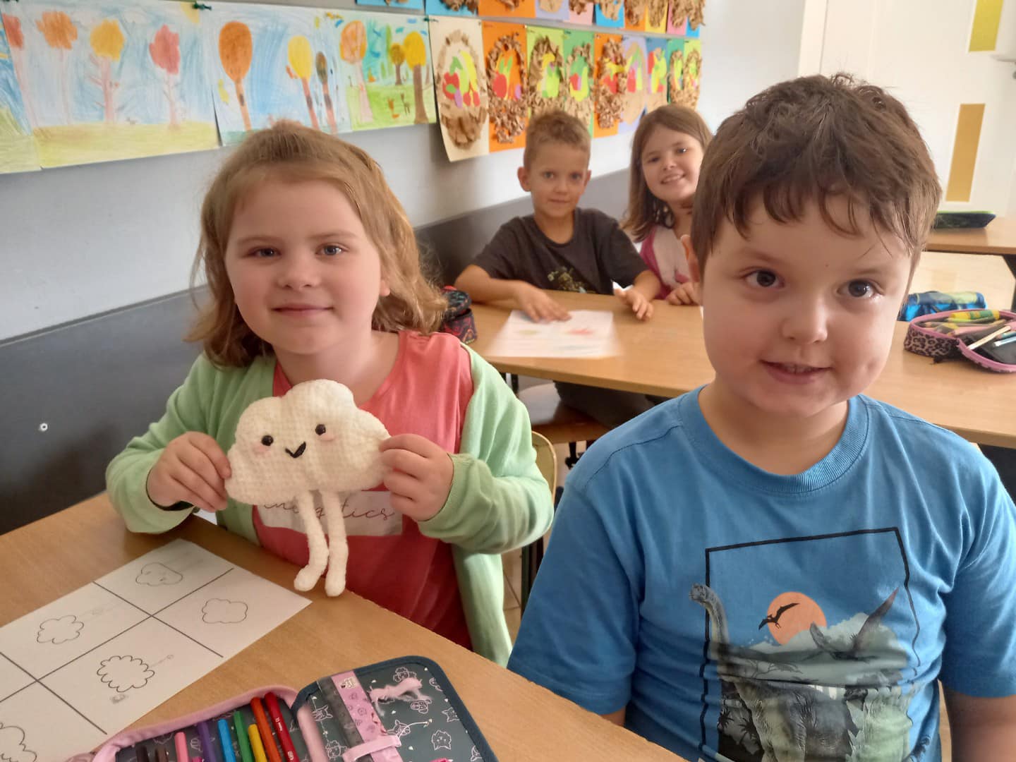 Pierwszoklasiści rozpoczęli Międzynarodowy Projekt Edukacyjny CZYTAM Z KLASĄ – LEKTURKI SPOD CHMURKI – wspierający rozwój czytelnictwa. Tegoroczna V edycja będzie realizowana pod kryptonimem: NA TROPACH DOBROCZYNNOŚCI! Zainspirowani „Rozchmurzonym opowiadaniem na powitanie” podjęliśmy się wielu działań z chmurką w tle: – Za pierwszakami pierwsze spotkania z chmurką Tosią, która przez cały rok szkolny będzie zachęcać do czytania, ale także będzie przewodnikiem dzieci na tropach dobroczynności. W klasie Ia klasowa chmurka powstała na szydełku, zaś uczniowie Ib wykonali swoją chmurkę z pomponów robionych z włóczki. Chmurka zawisła w projektowym kąciku w klasie. – Każdy pierwszoklasista w kreatywnych rysunkach, wyczarował w co mogła się zmienić według niego chmurka Tosia. – Poznaliśmy przysłowia z chmurką w roli głównej. – Dzięki filmom, obserwacji nieba poznaliśmy rodzaje chmur, wiemy jak powstają, wykonaliśmy również chmury z waty, które zawisły w naszych kącikach projektowych. – Wybraliśmy też lektury do pierwszego modułu. W klasie Ia będzie to „Detektyw Pozytywka”, w klasie Ib – „Kopciuszek”. To bohaterowie tych książek pokażą wkrótce pierwszakom jak być dobrym dla ludzi.