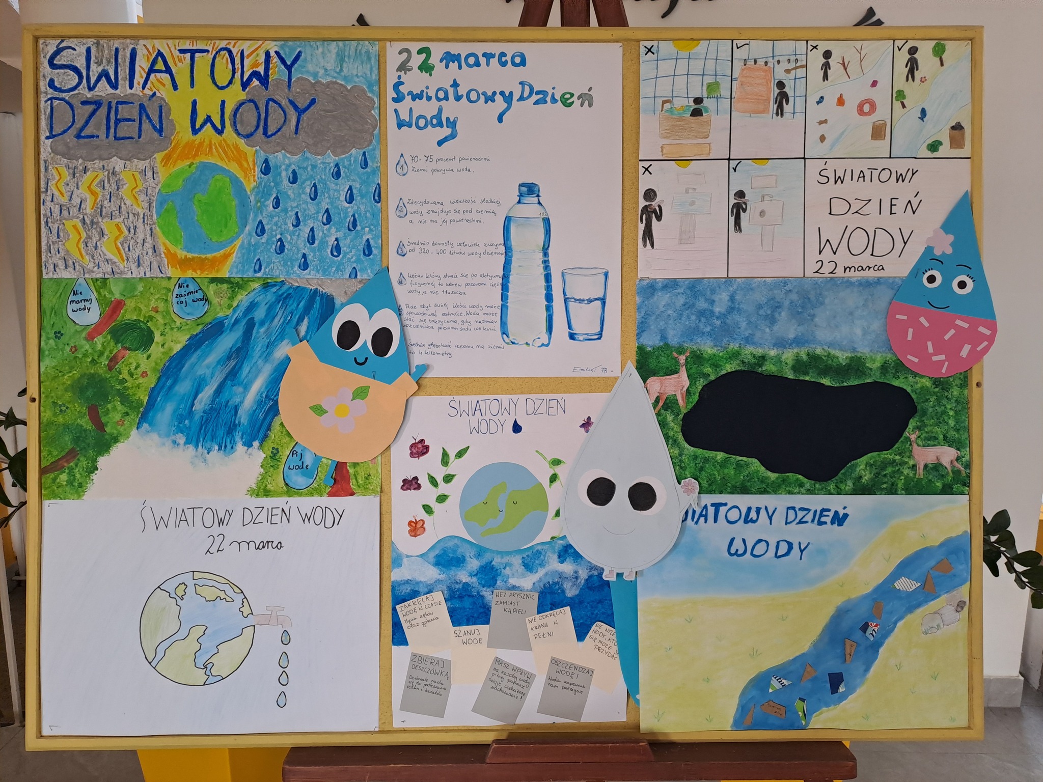 Woda w kranie, w butelce, na powierzchni Ziemi i w jej głębi… jest wszędzie. Tak powszechna i dostępna. Ale czy na pewno? Globalne ocieplenie, wzrost liczby ludności, zanieczyszczenia wody, jej codzienne marnowanie – to główne przyczyny zwiększającego się problemu niewystarczającej ilości wody pitnej na świecie. Szacuje się, że już w 2030 – 2040 roku aż 2/3 świata, w różnym stopniu będzie doświadczać niedoboru czystej wody pitnej. Polska jest jednym z państw w Europie, gdzie zasoby wodne są najbardziej ograniczone. Średnie roczne zasoby wodne na mieszkańca w Polsce to ok. 1600 m³ (średnia europejska to ok. 4300 m³). Szanuj wodę – to jedno z haseł prac plastycznych wykonanych przez uczniów z okazji Światowego Dnia Wody obchodzonego 22 marca.