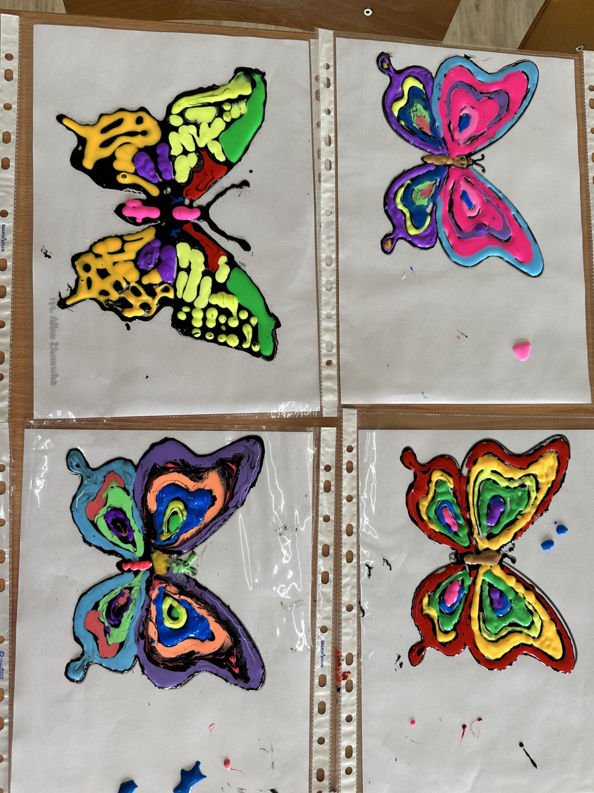 Dzisiejsze zajęcia trzeciej grupy świetlicy były niezwykłe i pełne kreatywności. Postanowiliśmy połączyć sztukę witrażu z motywem motyli, tworząc wyjątkowe witrażowe motyle z farb witrażowych. Naszą inspiracją był znany twórca witraży – Gerchard Richter.