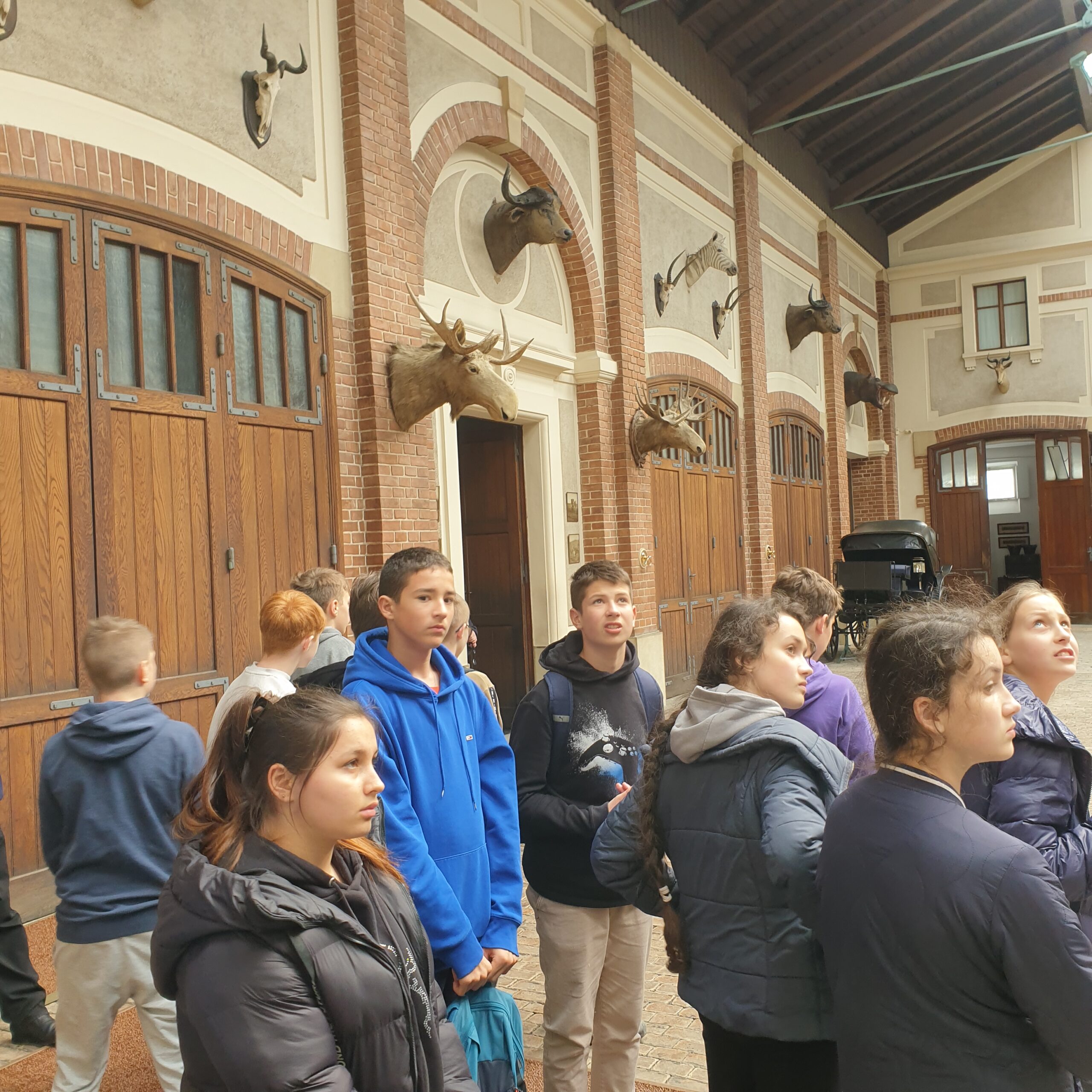 Następnie udaliśmy się do stajni i wozowni. Stajnie posiadają zachowaną oryginalną częścią dla koni wierzchowych oraz Szorownię Galową i Hol, w których ustawiono pojazdy konne należące do Muzealnej Kolekcji Pojazdów. Zobaczyliśmy dwie oddzielne kolekcje pojazdów konnych: historyczną, związaną z rezydencją po rodzinie Potockich liczącą 55 pojazdów i muzealną, gromadzoną po II wojnie i wciąż otwartą, która liczy dzisiaj blisko 80 pojazdów. W Hali Zaprzęgowej podziwialiśmy trofea – zwierzęta przywiezione przez ostatniego właściciela zamku z afrykańskiego safari.