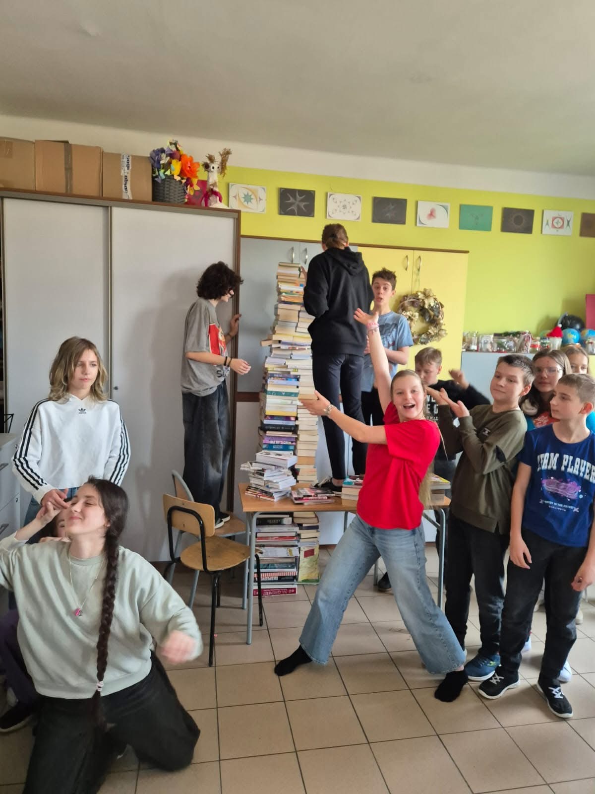 Uczniowie wzięli udział w międzyklasowej rywalizacji na najwyższą wieżę czytelniczą ułożoną z przyniesionych książek.