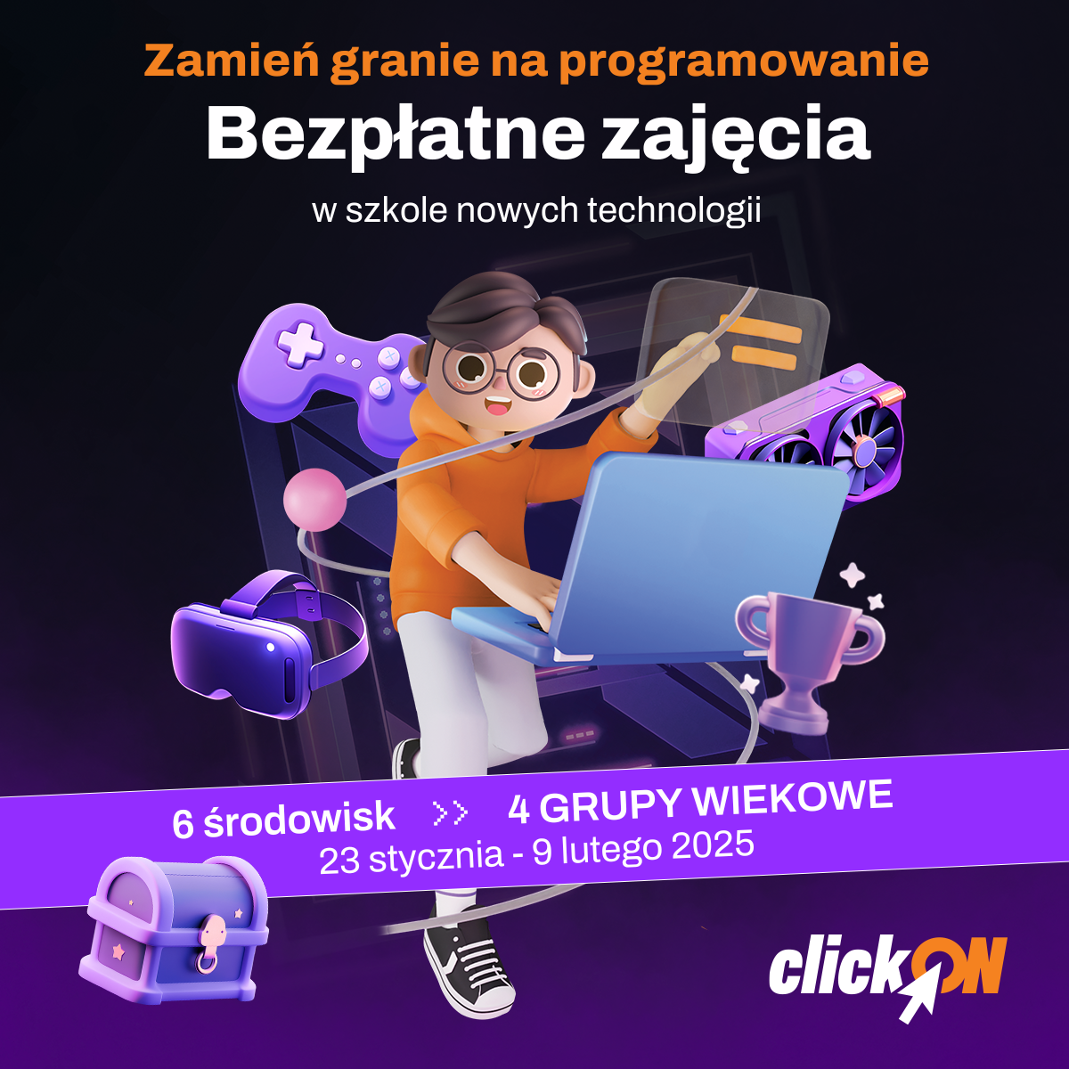 Wraz ze zbliżającym się nowym semestrem nauki Giganci Programowania serdecznie zapraszają Uczniów z Państwa Szkoły na warsztaty “ClickOn – zamień granie na programowanie”, czyli bezpłatne zajęcia w naszej szkole nowych technologii.