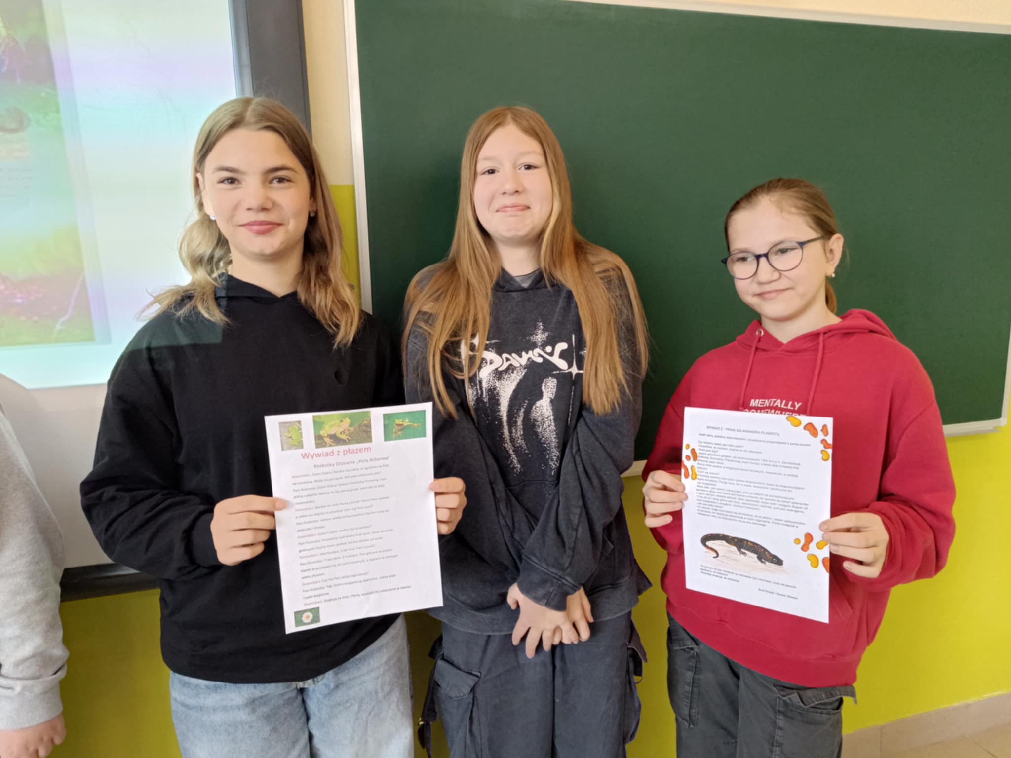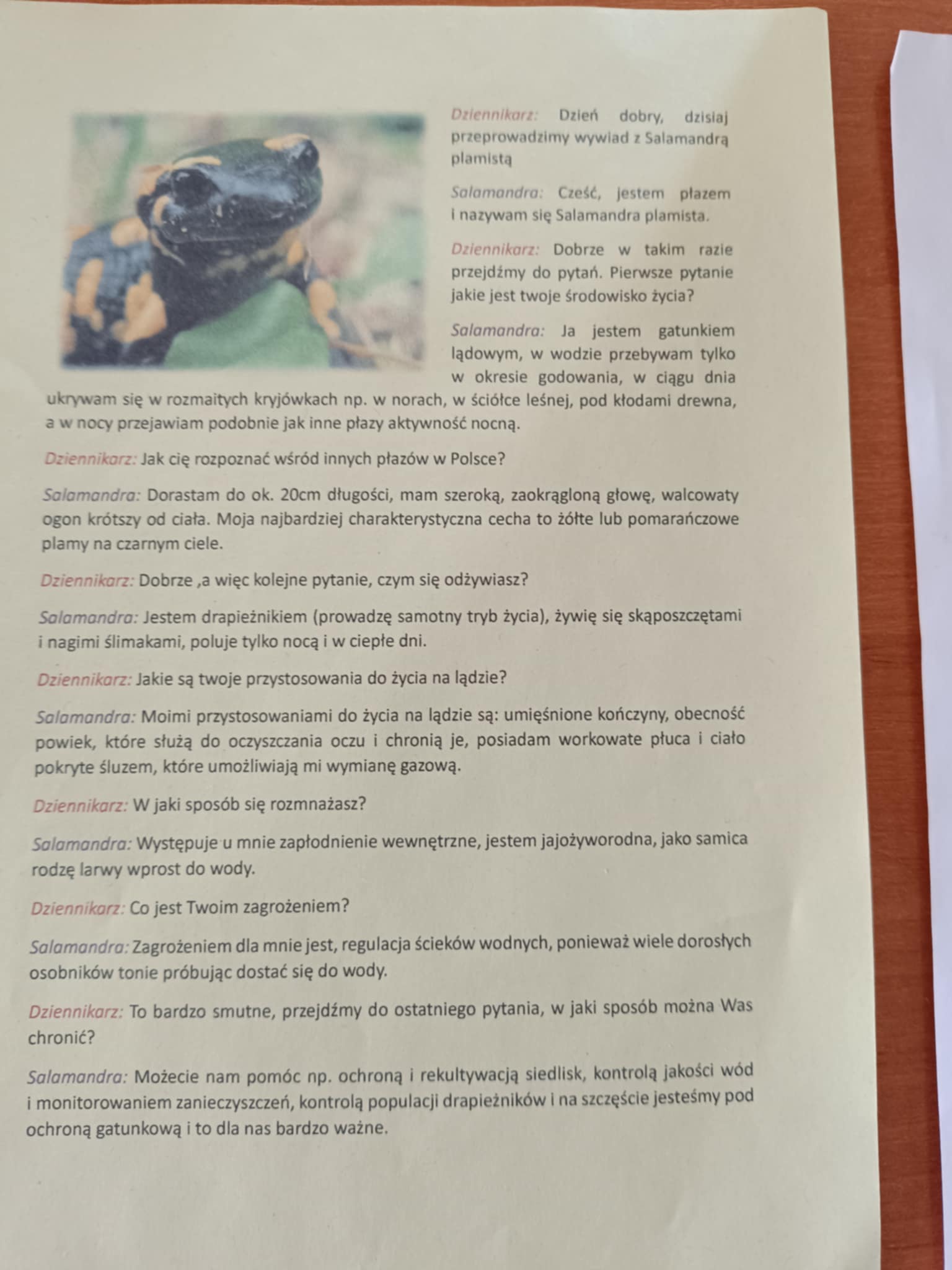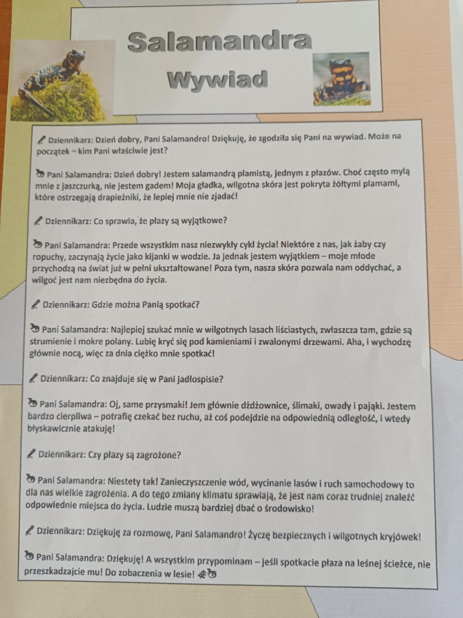 Tym razem uczniowie pracując w parach musieli wcielić się w rolę dziennikarzy i przygotować wywiad z wybranym przez siebie płazem. Na lekcję przyszli z przygotowanymi przez siebie materiałami o wybranym płazie, a następnie przygotowywali listę pytań i odpowiedzi dotyczących np. jego środowiska życia, przystosowań do życia w wodzie i na lądzie, odżywiania, rozwoju oraz zagrożeń i sposobów ochrony płazów. Później zostały już tylko szlify i pełne wywiady gotowe! Brawo!!!